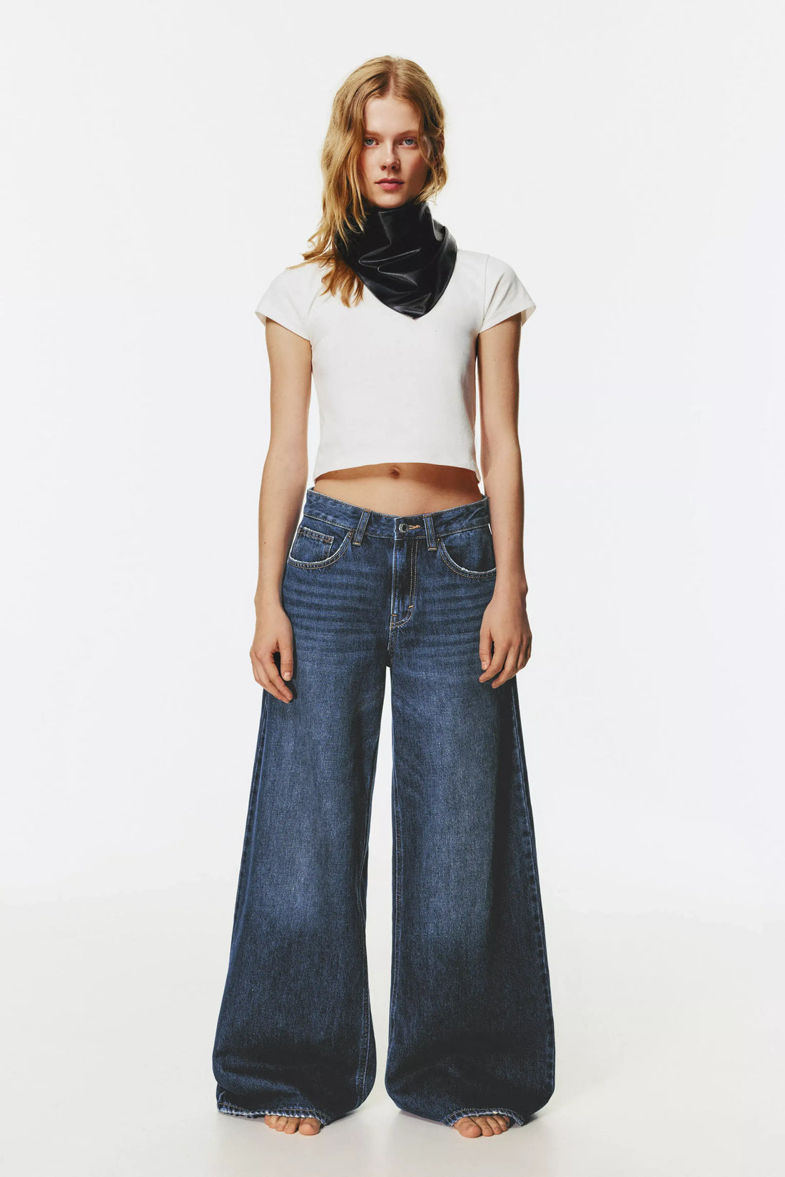 Brand: LT1K Fit: Wide-LegMaterial: 100% Cotton(Non-Stretchable)Length:40-42Colour : Dark BlueRise: High-Waisted.